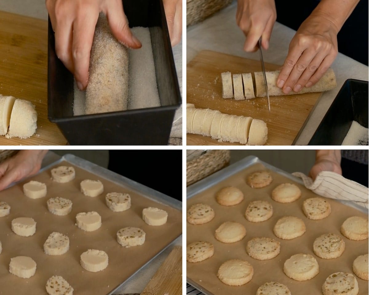 - Сформуйте. Охолоджений «рулет» обкачайте в цукрі (або цукор+подрібнені фісташки), наріжте кружечки товщиною ~1-1,5 см і викладіть на деко, застелене пергаментом.
